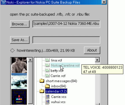 Noki is a utility to explore and extract Phone book, Text message, MMS, Calendar, Memo, Email, Bookmark and other user files from the backup file of Nokia phone (using Nokia PC Suite).